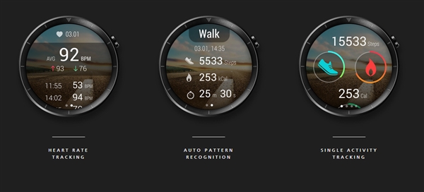它采用了多数人更喜欢的圆形表盘设计,1.4寸AMOLED屏幕,分辨率400×400,直径42毫米,外层覆盖蓝宝石玻璃,支持始终点亮,而按钮也放置在更适合操作的2点钟方向。