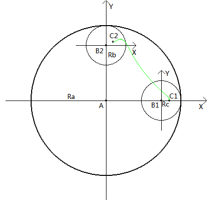 进一步分析,小圆的运动可以分解为两个部分:小圆圆心绕大圆圆心公转、小圆绕自身圆心自转。设大圆圆心为A,半径为Ra,小圆圆心为B,半径为Rb,轨迹点为C,半径为Rc(BC距离),设小圆公转的弧度为θ [0,∞),如图: