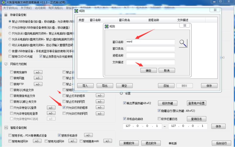 如果你觉得上面的方法比较复杂,同时也存在着被员工反向修改而重新可以安装软件、可以运行程序的风险。那么,也可以借助第三方软件来实现禁止电脑运行程序。例如有一款“大势至电脑文件防泄密系统”(下载地址:http://www.grablan.com/monitorusb.html),只需要在电脑安装之后,就可以有效禁止U盘、禁用USB存储设备的使用,同时还可以防止邮件泄密、防止网盘泄密、防止FTP文件外发泄密以及防止QQ发送文件泄密等,有效保护电脑文件安全。如下图所示: