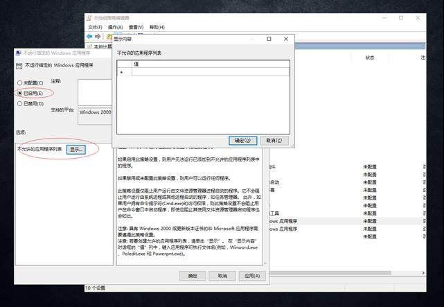 输入之后点击下列确认按钮。然后进入本地策略组--用户配置--管理模版--系统--不运行指定的Windows应用程序。即将在这里的未配置选择为已启用,然后点击现实(依次双击展开)