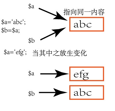 <?php $a="ABC"; $b =&$a; echo $a;//这里输出:ABC echo $b;//这里输出:ABC $b="EFG"; echo $a;//这里$a的值变为EFG 所以输出EFG echo $b;//这里输出EFG ?>