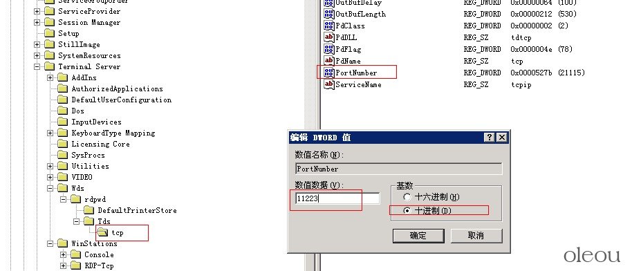 PortNamber值了吗?其默认值是3389(改为十进制显示),修改成所希望的端口,例11223