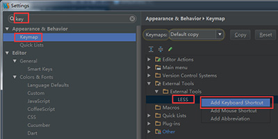 7、在Settings 面板顶端输入“key”,找到快捷键设置项“Keymap”(快捷键),在右侧找到“External Tools”(外部工具)点开,点选“LESS”并单击右键,选择“Add Keyboard Shortcut”,在出现其面板的“First Stroke”处同时按下“Alt+B”键,这样就将“Alt+B”设置为将less文件编译成css文件的快捷键。当然你可以根据自己的实际情况设置成其它的快捷键。确认好后点Settings 面板右下的“OK”按钮。