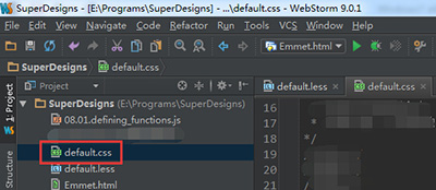 5、开启JetBrains WebStorm 9.0.1程序,打开一个含有leess的项目,该项目中含有“default.less”文件。