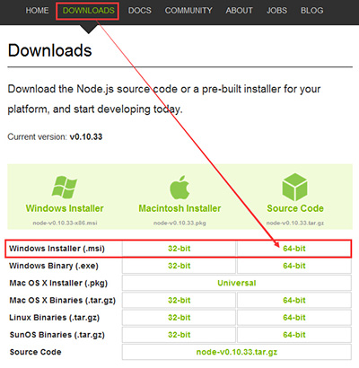 1、 打开Nodejs官网http://www.nodejs.org/,点“DOWNLOADS”,点64-bit下载“node-v0.10.33-x64.msi”。