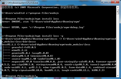4、“开始”-->cmd,打开cmd程序,输入“cd C:\Program Files\nodejs”,进入nodejs安装目录。输入npm install less -g 回车,安装less组件。稍等片刻,完成后,你会发现C:\Users\wind\AppData\Roaming\npm\node_modules 目录下有less组件。