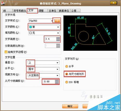5、进入“文字”设置:首先选文字样式,主要就是选字体,点“...”进入,选宋体或其他的字体;然后修改文字大小3.4;然后修改文字位置和文字对齐方式。文字对齐方式选“与尺寸线对齐”是最好用的。其他的两个也可以试试,看看有什么区别。