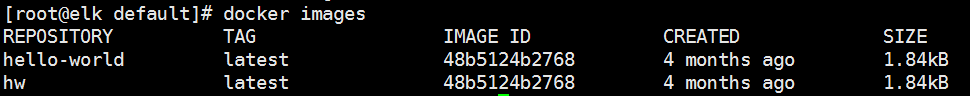 我们将之前下载的“hello_world”镜像重命名为“hw”,使用images命令查看会发现列表中已经多了一个名为“hw”的镜像。