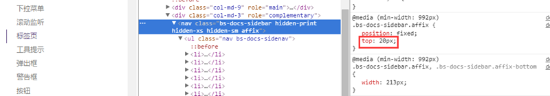 第一,从sticky的效果上来说,sticky元素在固定前后,不会变化的是相对浏览器左边的位置以及sticky元素的整体宽度,可能会变化的是相对浏览器顶部或底部的位置和sticky元素的高度,而上文提供的实现中把后面两个会变化的值都当成了不变的值。为什么在固定的时候top值或bottom值就一定是0?当然可以不是0阿,比如top: 20px,bottom: 15px,在某些场景里,加上一些这样的偏移,sticky的效果会更好看,比如bootstrap官方文档中用到的affix组件实例(这个组件的功能跟本文实现的sticky组件是差不多的):