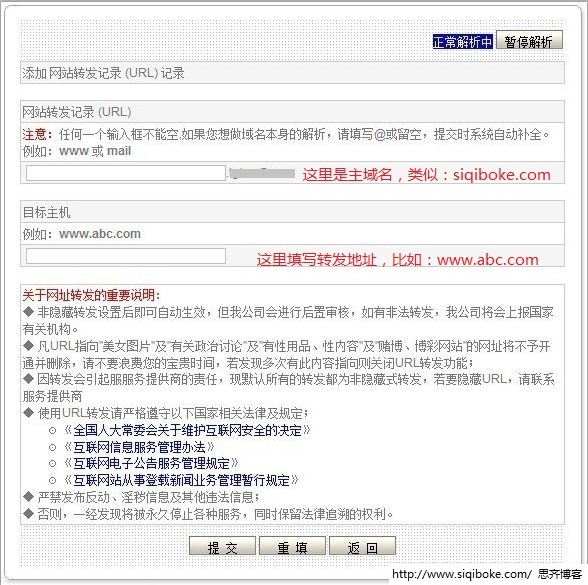 比如想把http://www.uoften.com转发到http://www.abc.com,则只需要在第一个框框里头填写www,下面填写www.abc.com即可。