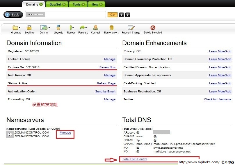 DNS全称Domain Name Server,中文叫域名服务器,负责域名到IP地址的映射转换。我们在域名注册完成后,域名的DNS都有默认的设置,当然这些设置一般都是指向注册方的默认地址,用户需要正常使用域名则必须对DNS进行修改或添加记录。要修改DNS设置,首先进入DNS完整控制界面,点击图2中的Total DNS Control链接进入。