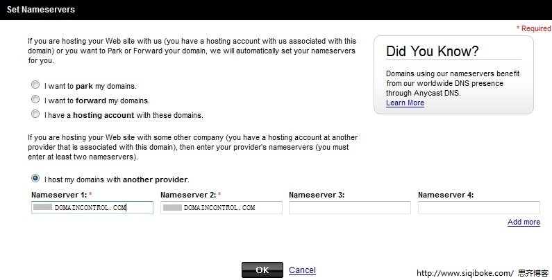 上图中,分别有四个选项:Park停泊域名、Forward转发域名、Hosting account设置到官方主机、Another Provider设置其它解析提供方,前三项Godaddy会为您自动分配NAME SERVER,各项功能如下: