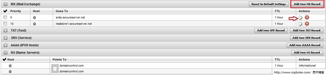 如果您的是国内域名,其设置方法跟上文类似,只是语言不同而已,国内一般的域名控制面板都类似下图: