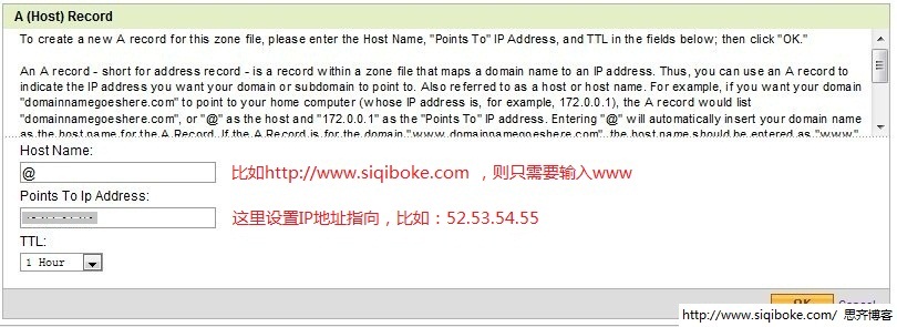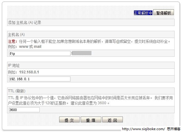 在上图中的TTL是指TIME TO LEVEL,表示DNS记录在DNS服务器的缓存时间,是为加快域名解析速度而设置,默认设置即可,也不要太长,如果设置10小时,如果期间修改了IP地址,很可能需要等待几个小时或更长时间,DNS状态才能得到刷新,影响使用。