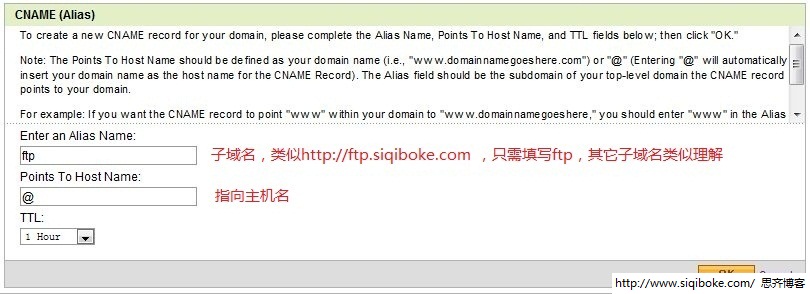 CNAME别名设置方法类似于A记录设置,比如要设置http://ftp.uoften.com,则只需要在Alias Name中填写ftp,Points to Host Name中填写别名地址即可,很多虚拟主机商一般都会在主机设置里同时提供IP和CNAME名,用户只需要根据实际情况,设置一个生效即可,比如要设置http://ftp.uoften.com到别名user1234.xxx.com,则只需要在Points to Host Name中添加user1234.xxx.com即可(在有些面板中可能最后还需要加个.号,有些会自动添加,这里就需要注意一下是否需要添加),下图中Points to Host Name值是@表示CNAME到默认的顶级域名地址(系统自动增加),只是个约定。