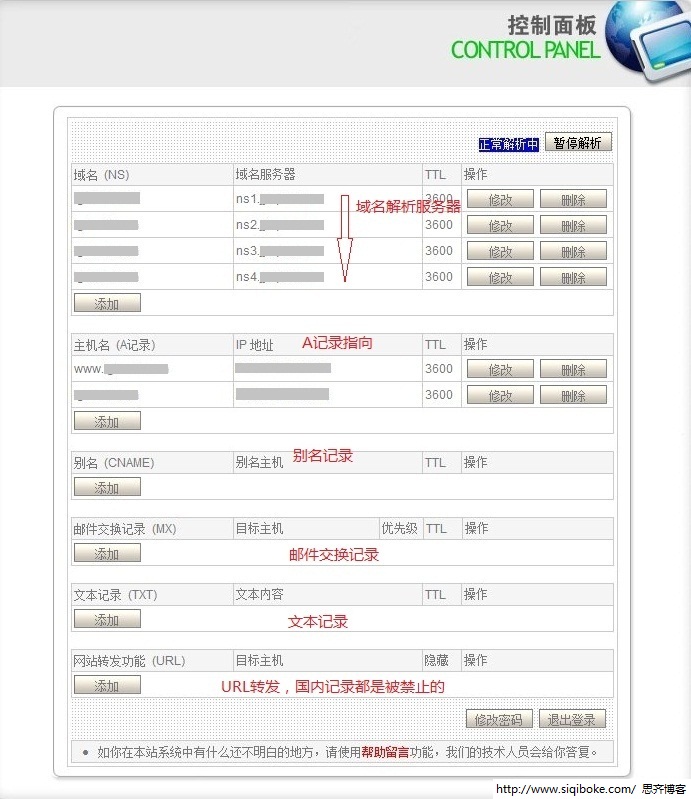 在上图中,最底下是域名服务器地址,我们最常用的有三个设置:A记录、CNAME别名和MX(Mail Exchange)记录,其中A记录用来设置WEB服务器的IP指向,CNAME用来设置别名指向,MX记录用来设置邮件交换记录指向。