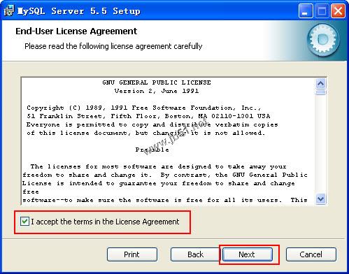 3、打开End-User License Agreement对话框,选中I accept the terms in the License Agreement复选框,单击Next按钮,如图所示: