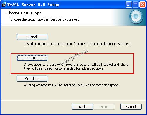 4、打开Choose Setup Type对话框,在其中列出了3中安装类型,分别是Typical、Custom和Complete。如果选择Typical或Complete这两种安装方式,将进入确认对话框,确认选择并开始安装。如果选择Custom,将进入Custom(自定义)对话框。在这里选择Custom,单击Custom按钮,如图所示:
