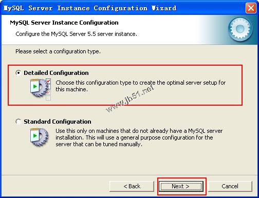 3、为了学习MySQL的配置过程,在此选择详细配置选项,单击Next按钮,进入服务器类型对话框,可以选择3种服务器类型,选择哪种服务器将影响到MySQL Configuration Wizard对内存、硬盘和过程或使用的决策,如图所示:
