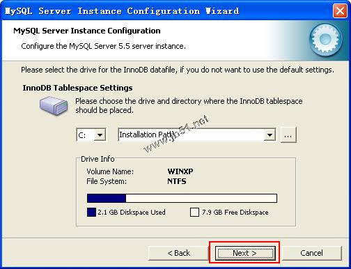 5、单击Next按钮,进入InnoDB表空间配置对话框,这里可以为InnoDB数据文件选择储存位置,一般可以直接选择默认,Drive info显示了存放位置的分区信息,如图所示: