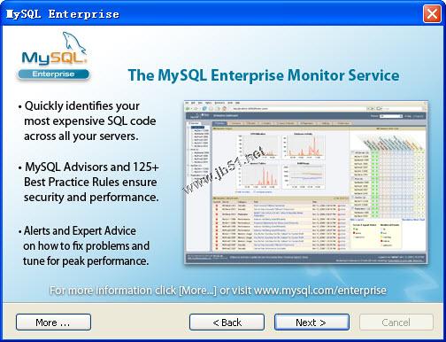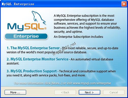 9、安装完成后,将弹出有关MySQL Enterprise版本的介绍说明对话框,单击【More】按钮,如图所示: