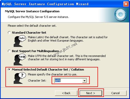 8、单击Next按钮,打开用于设置MySQL默认语言编码字符集的对话框,该对话框提供了3种类型字符集,如果要支持中文,常用的选项有latin1、gb2312、gbk或者utf-8,如果都是英文字符,可以选择latin1,如果要支持中文,可以选择国标gb2312或者gbk,如果要支持多国语言可以选择utf-8,在这里选择utf-8,从第三个选项下拉列表中选择utf-8,选择这个还有一个原因,就是用java去连接该数据库的时候避免出现乱码的问题,如果出现了乱码的话,在连接的url后面加上“?useUnicode=true&characterEncoding=UTF-8”如图所示: