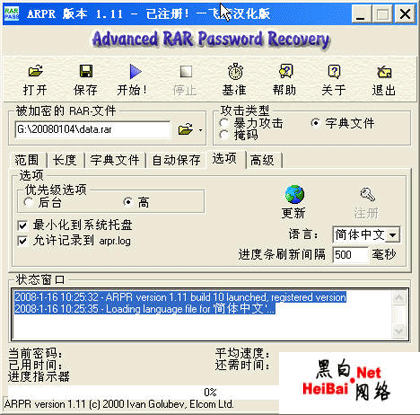 1.设置“ARPR1.11”。本案例中使用的是Advanced RAR Password Recovery 1.11汉化版本,因此直接运行主程序即可,然后在主界面中对ARPR进行设置,如图1所示,在“优先级选项”中选择“后台”,并选择“运行记录到arpr.log”,然后单击“注册”按钮输入汉化作者提供的注册码进行注册,最后在语言中选择“简体中文”。