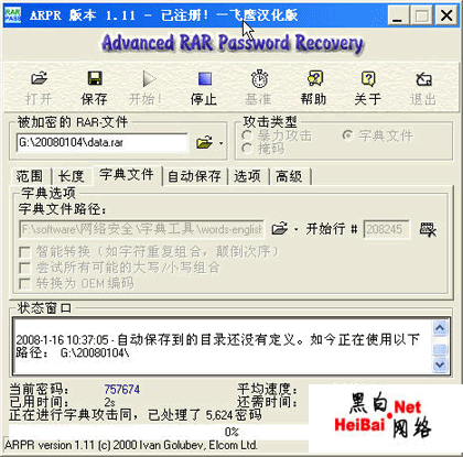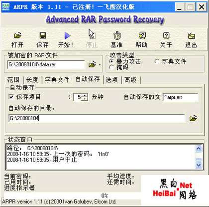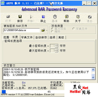 (1)“Advanced RAR Password Recovery 1.11汉化版”只能破解Winrar3.5以下版本,要破解Winrar3.5以上版本,需要下载其最新版软件arpr3.0版。
