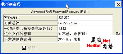 3.查看破解结果。 “Advanced RAR Password Recovery 1.11”破解结束后会给出一个“找不到密码”的提示,在该提示中会显示“密码总计”、“时间总计”以及“平均速度”等信息,如图4所示。