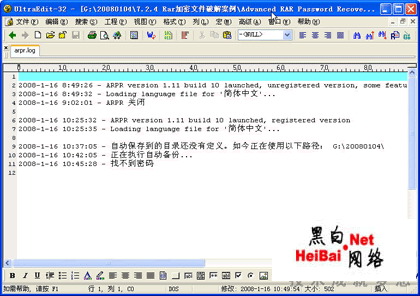 (1)arpr破解rar密码时,会生成一个破解日志记录。直接到“Advanced RAR Password Recovery 1.11”程序破解目录,然后打开“arpr.log”破解日志记录文件,如图5所示,日志文件会给出密码是否破解的记录。
