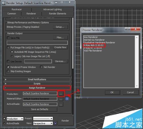 3、弹出对话框之后,我们选择基本选项(英文是Common)卷展栏,拉到最下面,有个渲染器选择,这里一定要注意选择的是V-Ray Adv 2.10.01,而不是V-Ray RT 2.10.01,这两个是不一样的。