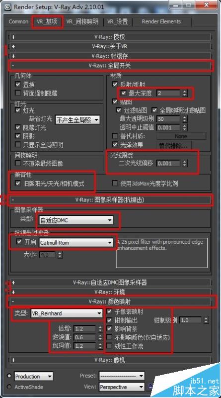 5、接下来项目就比较多了,VR基项里边需要设置三个卷展栏,图上已经给标上数字步骤,一定要对应好了红色线框里的内容