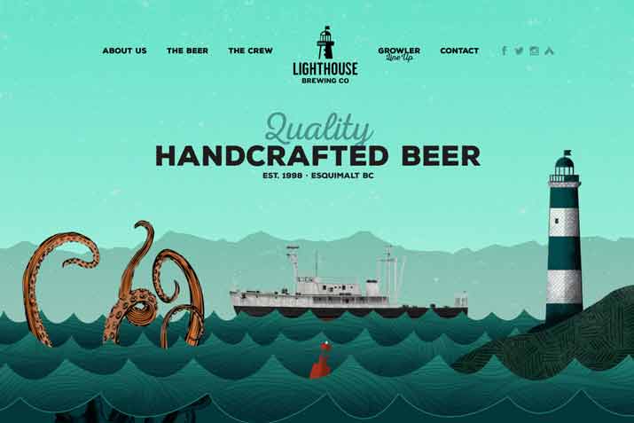 Lighthouse brewing在其网站设计上使用更暗,更完整的尖头图案,通过屏幕上动态的海洋和船只,让人有一种随波逐流的感觉。动画随着鼠标下滑继续滚动,最终的标志随之变成具有水彩感(与整个网站的背景一样)。这个设计要说明的是,你可以突破你对水彩的想法,创造出一些有点意想不到的风格。