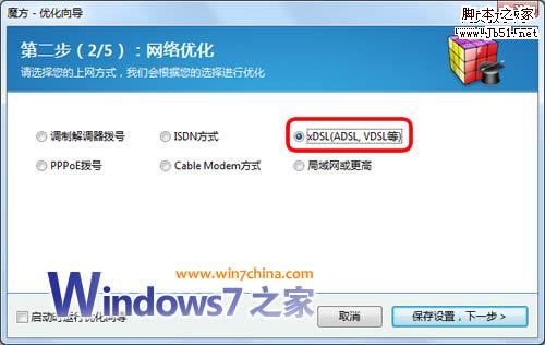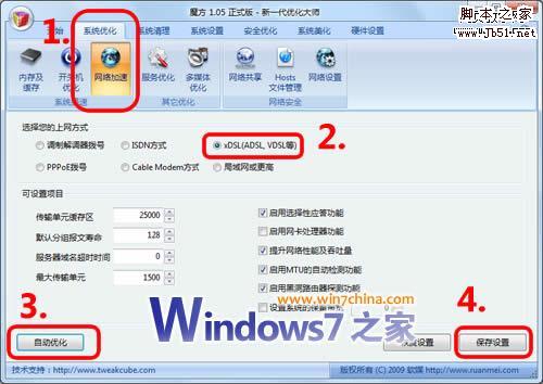 2、选择xDsl(ADSL、VDSL等),点击左下角的“自动优化”按钮,再点击一下“保存设置”按钮即可;