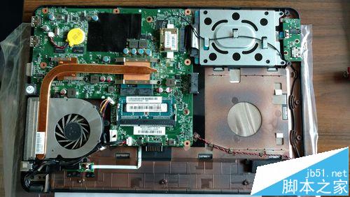 7、背壳整块拆下后,即可见CPU、内存、硬盘等所有部件。可对风扇进行清灰、或再继续拆卸硬盘、内存等,拆卸相应螺丝或扣具即可,不再累述。