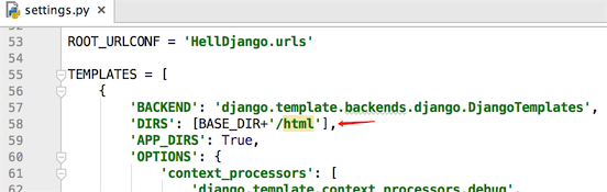 来到settings.py文件,在TEMPLATES-DIRS配置项中写上BASE_DIR+'/html'