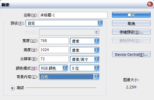 1、按Ctrl+N键新建一个文件,并设置其对话框如图1所示,确定后创建一个新的空白文件。