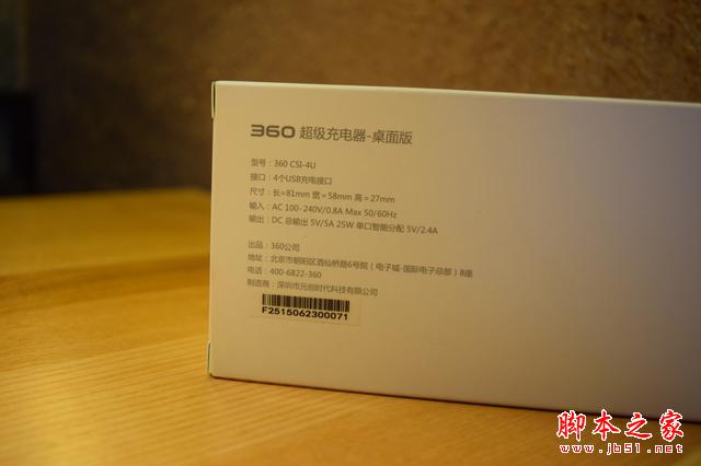 包装的别面印有产品信息,360超级充电器桌面版的型号命名为360 CSI-4U,4个USB充电接口,三围尺寸分别是长宽高81x58x27mm;输入AC100-240V,兼容全球电网;输出5V 5A 25W Max,单口智能分配5V 2.4A。出品方为360公司,制造商为深圳市元创时代科技有限公司。这家企业是否为360最新投资的数码硬件公司,目前还不清楚两者的关系。包装盒上贴有一组序列号,方便360公司追溯供应链生产批次和日期。