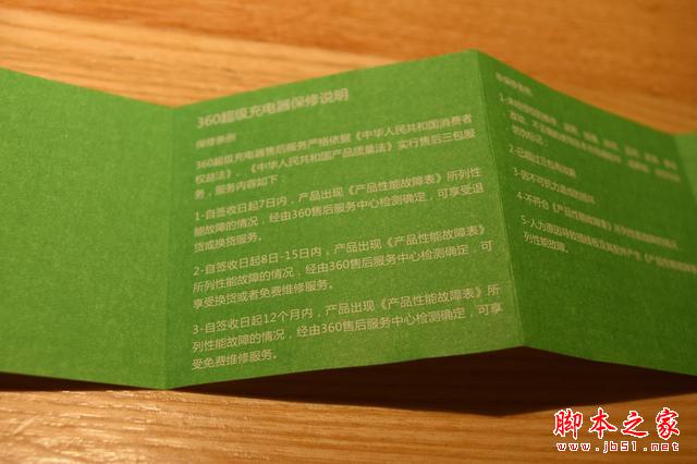 说明书背面为绿底白字的360超级充电器保修说明,这里我们找到了产品的三包信息,7天故障可退换,8-15天内换货维修,12个月内免费维修。作为一款采用了超声波封装工艺的数码产品,维修是不大可能,保修期内大多数还是给予更换。