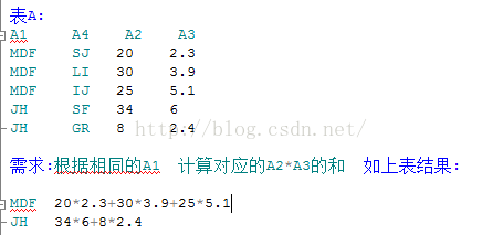 SELECT A1,SUM(A2*A3) FROM A GROUP BY A1
