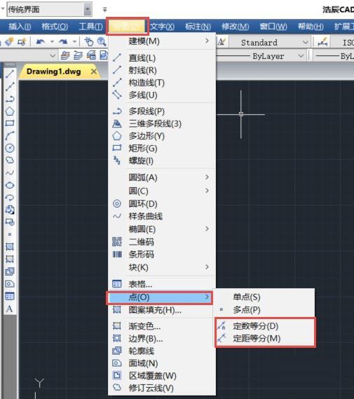 在CAD中有时我们想得到直线或曲线的等分点,有时我们想沿直线或曲线等距或等分排列图形,例如沿灯槽铺设一排射灯,或沿路边种上一排树。CAD高版本提供了沿线阵列的功能,但其实在CAD很早的版本就提供了定数等分和定距等分的功能,只是有点奇怪,按照常理大家认为这个功能应该归到“修改”命令中,但CAD的这两个功能隐藏在“绘图”菜单中,而且作为“点”对象的两个子功能,也就是在等分的同时通常会生成点对象,如下图所示。