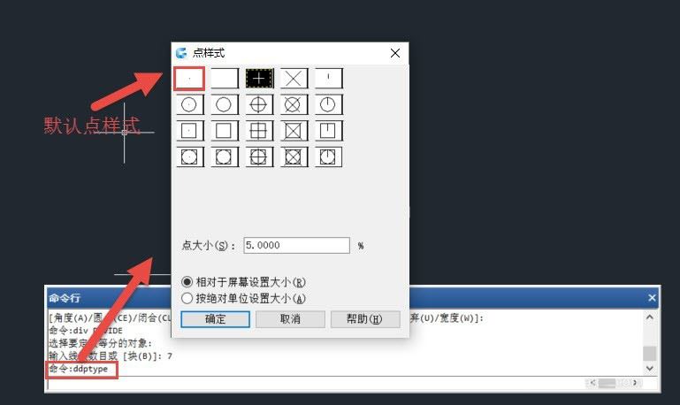 在格式菜单里选择点样式或者直接输入DDPTYPE命令,打开点样式对话框,选择一个十字的点样式,我们看看等分点生成效果,如下图所示。