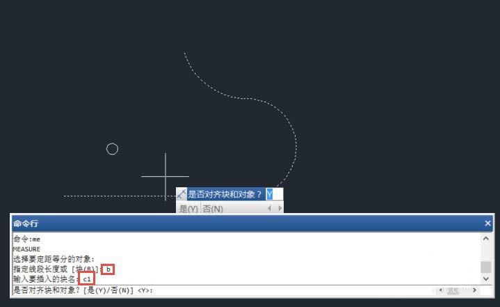4、命令行会提示图块在摆放的时候是否需要跟等分的曲线对齐,如果图块是有方向性的图形,我们可以选择输入Y让图块跟曲线对齐还是N让图块一直保持原始方向。