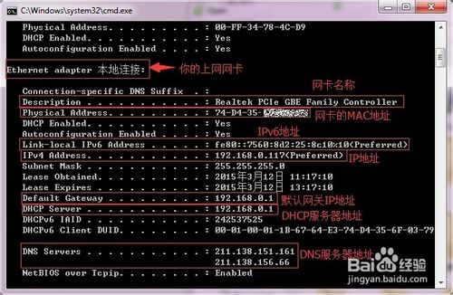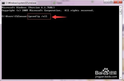 5、在cmd窗口中输入命令“ipconfig /all”,然后按“回车(Enter)”键。找到信息最多的”本地连接“信息。