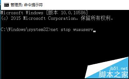 4、这时,将会打开命令提示符窗口。在命令提示符窗口中输入net stop wuauserv 后再回车,停止更新服务。