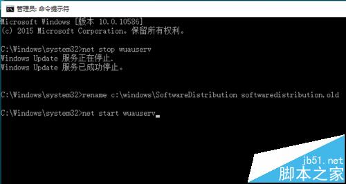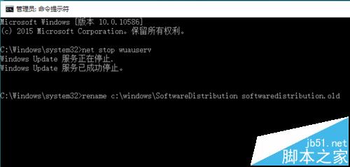 5、再输入rename c:\windows\SoftwareDistribution softwaredistribution.old后回车,重命名文件夹。