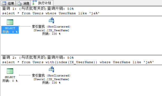 --set statistics io onselect * from Users where UserName like 'ja%'select * from Users with(index(IX_UserName)) where UserName like 'ja%'