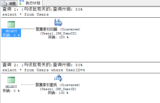 2.执行以下查询并查看查询计划,可以看到第一个SQL执行聚集索引扫描,第二个SQL执行聚集索引查找都没有使用到书签查找