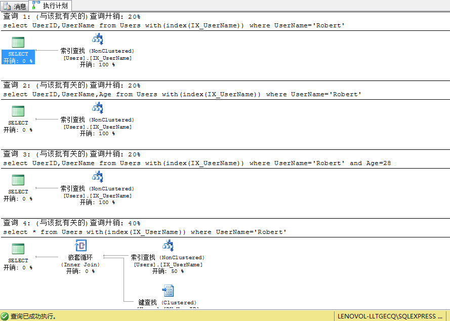 查询1:选择的列UserID是聚集索引PK_UserID的键列,UserName为索引IX_UserName的键列,查询条件列为UserName,由于索引IX_UserName包含了查询用到得所有列,所以仅需要扫描索引即可返回查询结果,不需要再额外的去数据页获取数据,故不会发生书签查找