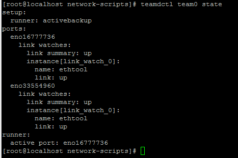 断开激活端口后再次用命令 #teamdctl team0 state 检查状态。